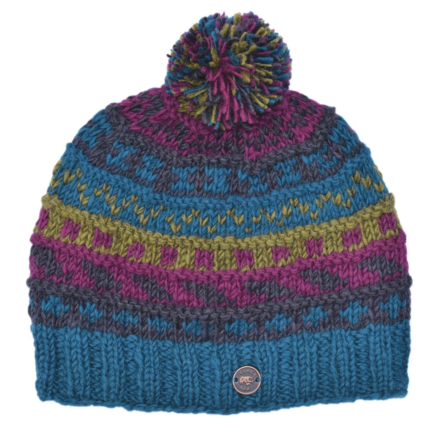 A multi pattern, pure new wool, ridged bobble hat.