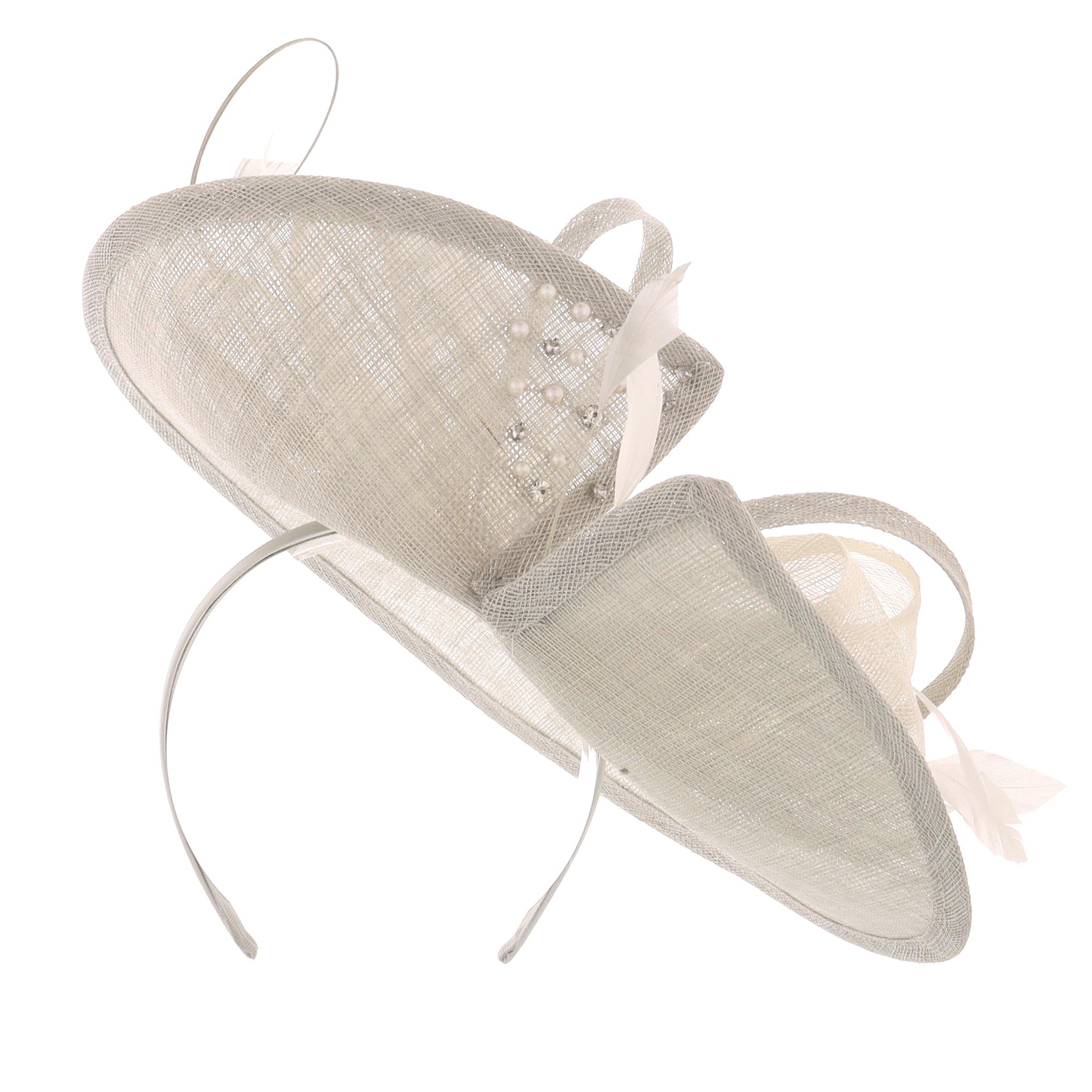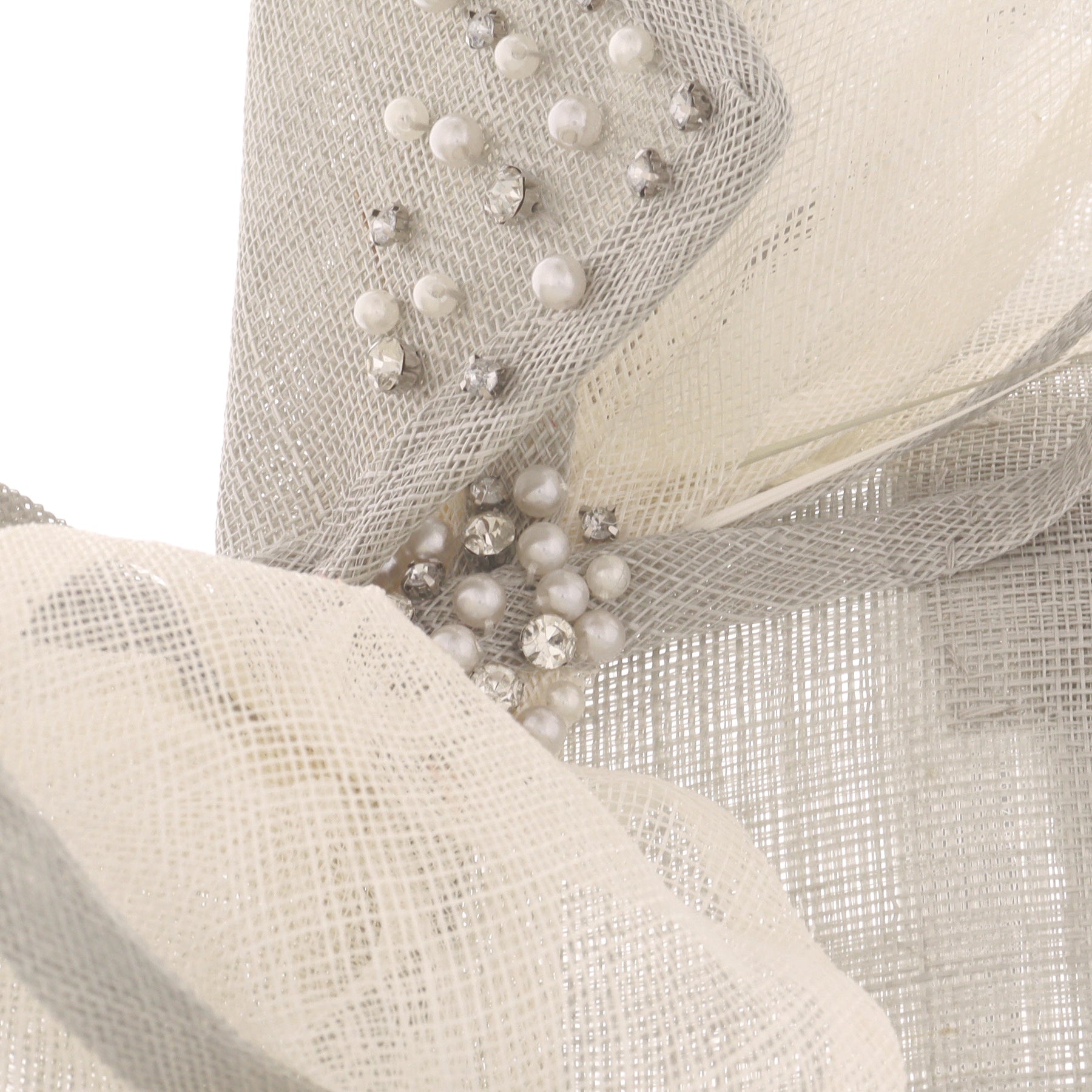 • Artistic Detailing: Features a breath-taking fusion of silver grey sinamay loops, an ivory bow and and delicate feathers that create a sense of airy movement.
