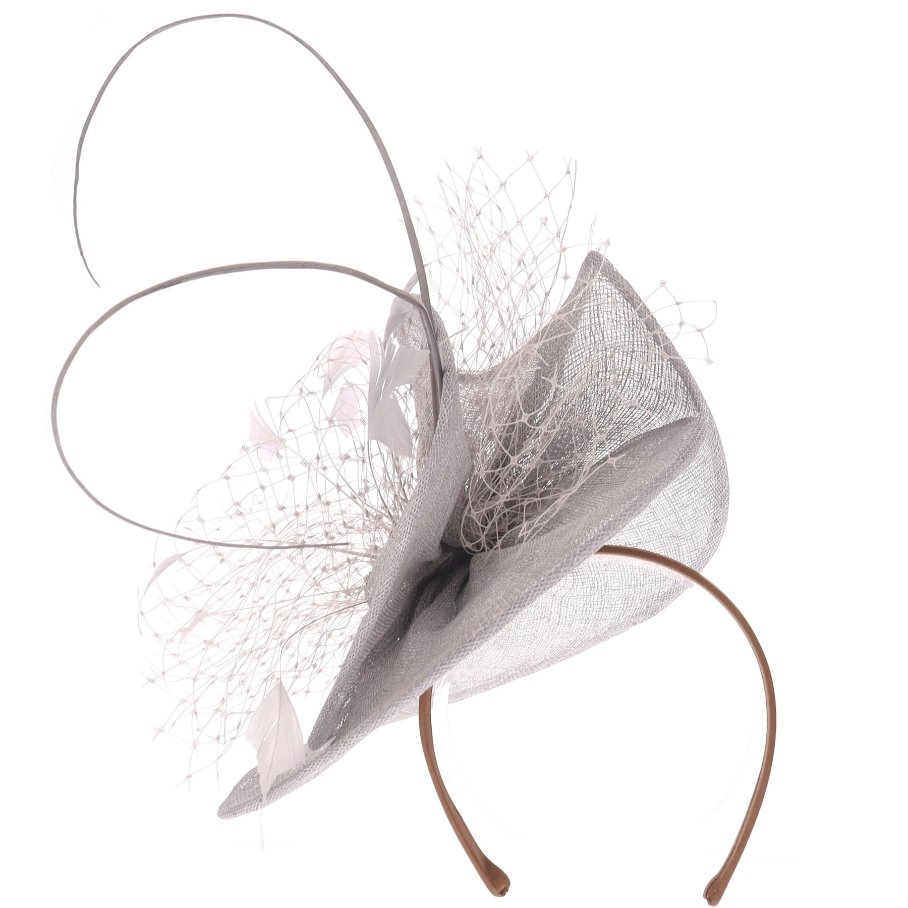 Elevate your special occasion attire with this striking fascinator from the renowned milliners at Failsworth. Expertly designed to create a bold, sculptural silhouette, this piece features a sophisticated arrangement of layered sinamay enhanced by neutral netting, soft feathers and quill detailing.
